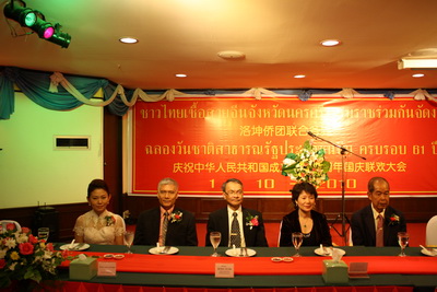 王應(yīng)邀出席洛坤府15僑團(tuán)國(guó)慶聯(lián)歡晚宴。洛坤府府尹、洛坤市市長(zhǎng)、府警廳廳長(zhǎng)及當(dāng)?shù)?5僑團(tuán)僑胞等400余人出席。副府尹在致辭中首先祝賀中華人民共和國(guó)成立61周年,并表示,新中國(guó)是年輕的,但中華大地歷史悠久,他欣賞中國(guó)古老絢麗的文化,同時(shí)感慨61年來中國(guó)的飛速發(fā)展和變遷,祝福中國(guó)日益繁榮昌盛,人民幸福安康。王在致辭中首先回顧了新中國(guó)成立以來的發(fā)展歷程,強(qiáng)調(diào)中國(guó)堅(jiān)持走和平發(fā)展道路;王還介紹了近年來中泰關(guān)系發(fā)展情況,并希望雙方以建交35周年為起點(diǎn),擴(kuò)大合作,共謀發(fā)展,共同創(chuàng)造更美好的未來。