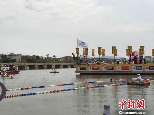 30日,第九屆海峽論壇——晉江市(安海)第六屆兩岸端午民俗旅游文化節拉開帷幕,引來兩岸民眾共“鬧”端午。圖為水上捉鴨活動。劉真真攝