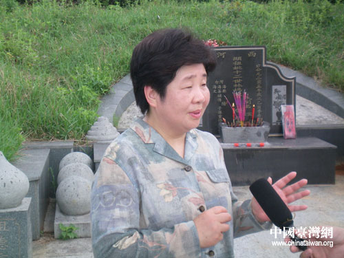 林明月在林媽宋氏祖墓前祭拜,并接受采訪。(漳浦縣臺辦陳文亮攝)
