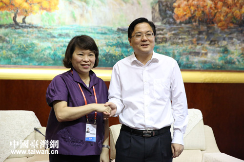 南寧市長(zhǎng)周紅波(右)會(huì)見中國(guó)國(guó)民黨副主席、臺(tái)灣嘉義市市長(zhǎng)黃敏惠。(圖片來源:南寧市臺(tái)辦)