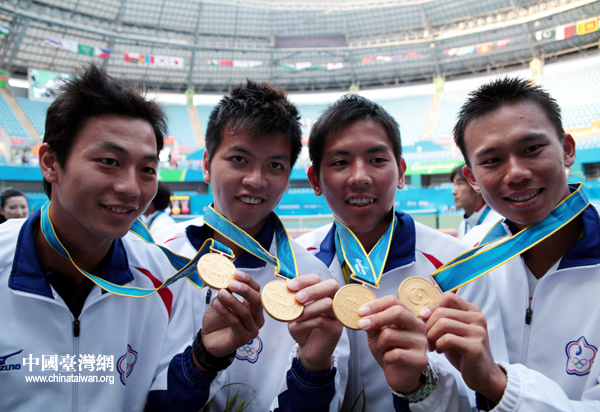 中華臺北隊男網團體選手披金,站上最高領獎臺。(中國臺灣網 鐘寶華 攝)