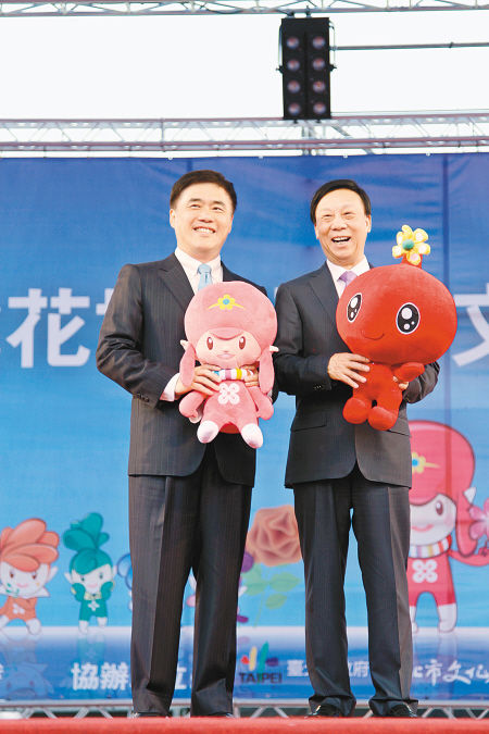 圖為陜西省委常委、西安市委書記孫清云與臺北市市長郝龍斌分別展示西安世園會和臺北花博會的吉祥物。