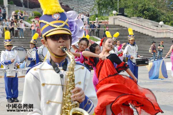 中國臺灣網5月2日上海消息 在5月1日開幕的“2014上海之春國際音樂節管樂藝術節上,一支身著藍白相間服裝,頂戴黃色花翎的隊伍十分引人注目。他們是來自臺灣的阿里山下的嘉義市博愛小學行進管樂隊。