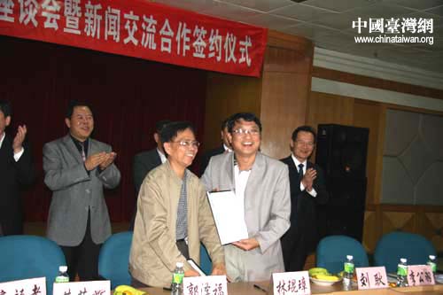 海南省新聞工作者協會副主席兼秘書長郭澤福與臺南縣記者協會理事林琨璋(右二)