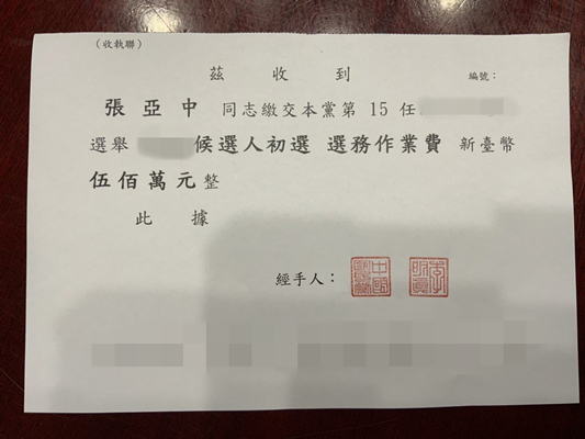 中國臺灣網6月6日訊 據臺灣《聯合報》報道,國民黨下周一公布2020初選名單。臺灣大學政治系教授張亞中今(6日)上午10時整,委托秘書到國民黨中央繳交5百萬(新臺幣,下同)選務作業費,其中2百萬現金3百萬本票(253萬與47萬各一張),組發會與財務室現場完成點收,確定已取得參選資格。