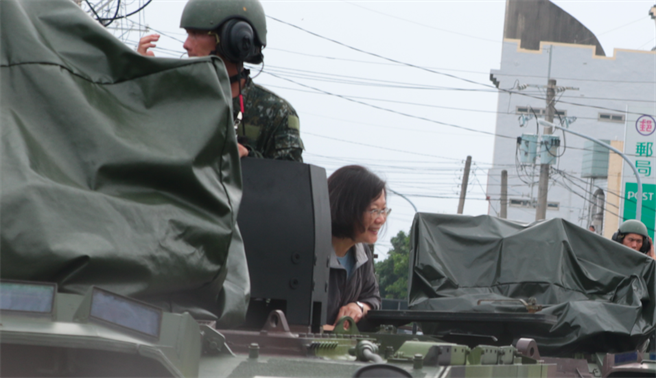 蔡英文搭云豹裝甲車進入尚在淹水的布袋鎮(zhèn)永安里勘災。(圖片來源:臺灣“中時電子報”)