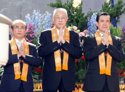 馬英九(右)、“行政院長”吳敦義(中)、“立法院長”王金平(左)8日出席浴佛祈福大會,與信眾一同祈福。 圖片來源:“中央社”