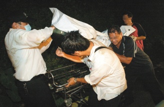 臺北縣爆發(fā)警消人員涉嫌與殯葬業(yè)者勾串大賺死人錢案,檢方昨天約談涉案人到案。圖為一般業(yè)者搬運(yùn)、處理浮尸遺體情形。圖片來源:臺灣《聯(lián)合報(bào)》