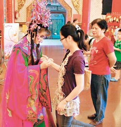 今天是農歷七夕,中國傳統的情人節,習俗是七夕娘娘的誕辰,在臺灣叫“七娘媽”,除了掌管人世間姻緣路外,更會照顧出生小孩平安長大。慈鳳宮昨天找人扮演七夕娘娘,在小提琴、薩克斯風幽揚樂聲伴奏下,為祈求姻緣的男女信眾,戴上五色珠的紅絲線,希望求得好姻緣、夫妻幸福、小兒平安。