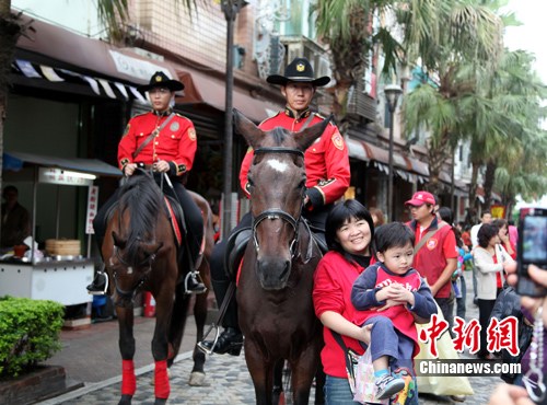 11月3日,每逢節(jié)假日,在臺北縣的旅游點(diǎn)鶯歌鎮(zhèn),穿著紅色牛仔服的臺北縣警察局騎警,總是能吸引游客爭著與其拍照。 中新社發(fā) 記者 陳立宇 攝