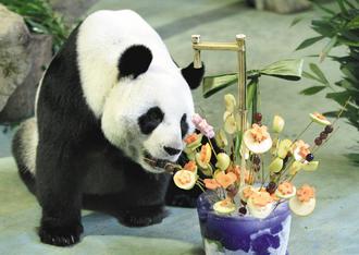 27日動物園費(fèi)盡巧思,分別為團(tuán)團(tuán)、圓圓制作不同的生日蛋糕。先獲得禮物的是團(tuán)團(tuán),它第一時間并沒有發(fā)現(xiàn)蛋糕,繞了幾圈之后才看見,立刻坐下大飽口福。