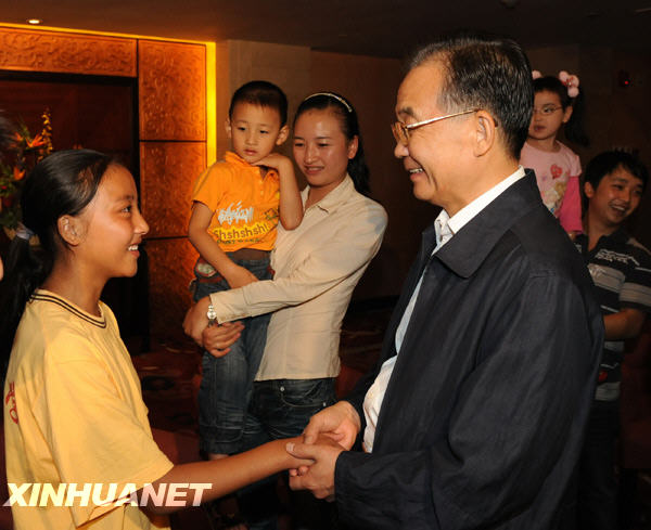 9月25日,中共中央政治局常委、國務院總理溫家寶在綿陽邀請四川地震災區部分基層干部群眾會面。這是溫家寶親切地拉著在北川中學初中一年級讀書的羌族小女孩劉小樺的手,詢問她的學習和生活情況。新華社記者黃敬文攝