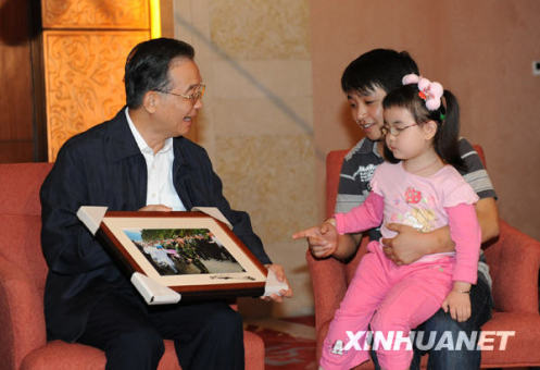 9月25日,中共中央政治局常委、國務院總理溫家寶在綿陽邀請四川地震災區部分基層干部群眾會面。這是溫家寶拿著照片,向4歲的宋馨懿(右)講述他在北川縣城外為剛剛獲救的小馨懿讓路的情景。新華社記者黃敬文攝