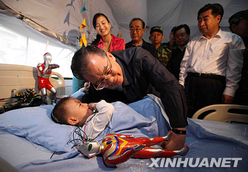 資料圖片 2008年5月23日,中共中央政治局常委、國務院總理、國務院抗震救災總指揮部總指揮溫家寶前往四川綿陽404醫院看望受傷群眾。這是溫家寶在監護室看望在地震中受傷的小朋友郎錚。 新華社記者 姚大偉攝