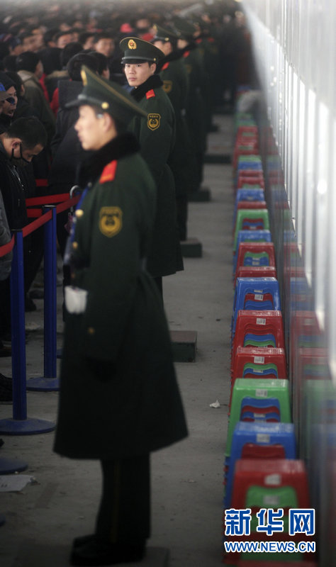 這是1月19日在鐵路上海站春運售票“大賣場”拍攝的售票窗口前擺放的板凳。當日是2011年春運首日,鐵路上海站春運售票“大賣場”在每個售票窗口前加設板凳,使旅客能坐著買票,免受彎腰低頭之累。 新華社發