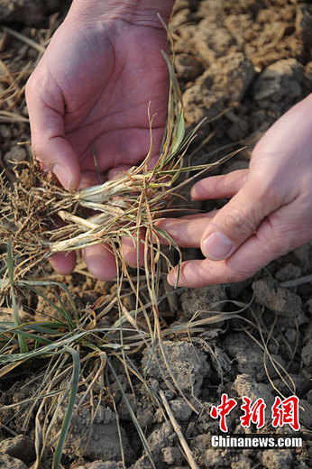 1月27日,安徽省亳州市譙城區古井鎮張集村村民孫明華正在查看干枯的麥苗。最新統計顯示,遭遇新中國成立以來最大旱情的安徽省淮北地區目前受旱面積達1124.2萬畝。據氣象部門預報,淮北地區1月底之前仍無明顯降水。張延林 攝