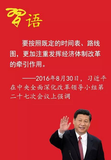 2016年8月30日,在中央全面深化改革領導小組第二十七次會議上,習近平強調,要按照既定的時間表、路線圖,更加注重發揮經濟體制改革的牽引作用。