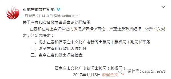 今年1月,左春和被免去石家莊文化廣電新聞出版局副局長的職務(wù),原因是在微博發(fā)表錯誤言論,嚴(yán)重違反政治紀(jì)律。