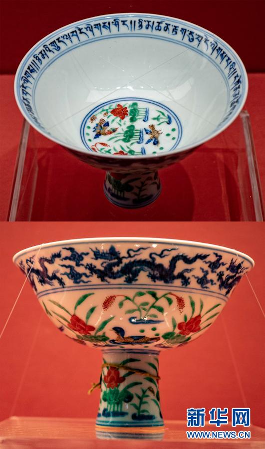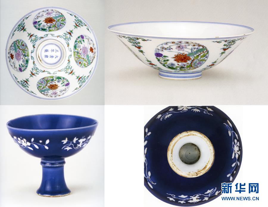 這張拼版照片顯示的是青花五彩蓮池鴛鴦紋高足碗(1月26日攝)。新華社記者 普布扎西 攝