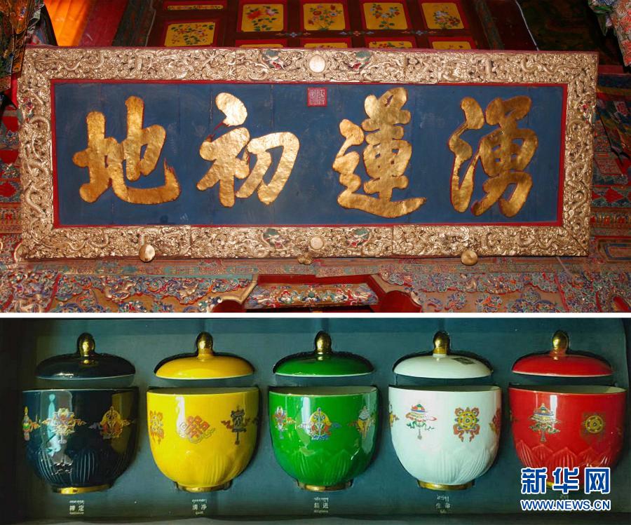 拼版照片:上圖為懸掛于布達拉宮西大殿正中上方、乾隆賜予八世達賴喇嘛的御筆金字匾額“涌蓮初地”;下圖為布達拉宮紅山腳下文創體驗店內的“蓮花五蘊杯”文創瓷器(1月26日攝)。新華社記者 孫非 攝