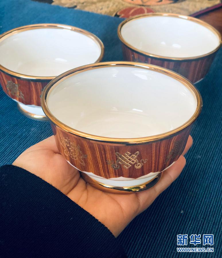這是出席2015年西藏自治區成立50周年慶;顒拥闹醒氪韴F贈送給西藏農牧民的骨質瓷酥油茶杯套裝(2月5日攝)。新華社記者 孫非 攝