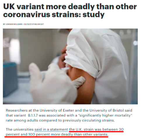 美國《國會山報》網站報道稱,《英國醫學雜志》發表的一項最新研究成果表明,英國發現的變異毒株在成年人中導致了“明顯更高的死亡率”,致死率比其他變異毒株高出30%—100%。這一結論也引起了美國公共衛生專家的警惕。