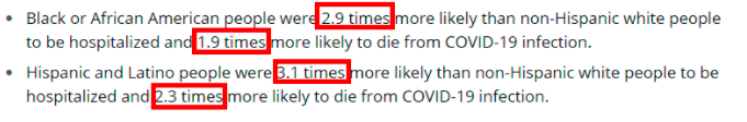 美國疾控中心的最新數據顯示,非洲裔和拉美裔美國人感染新冠肺炎入院率分別是美國白人的2.9倍和3.1倍,死亡率分別是美國白人的1.9倍和2.3倍,這與各種族所占人口比例完全不相匹配。