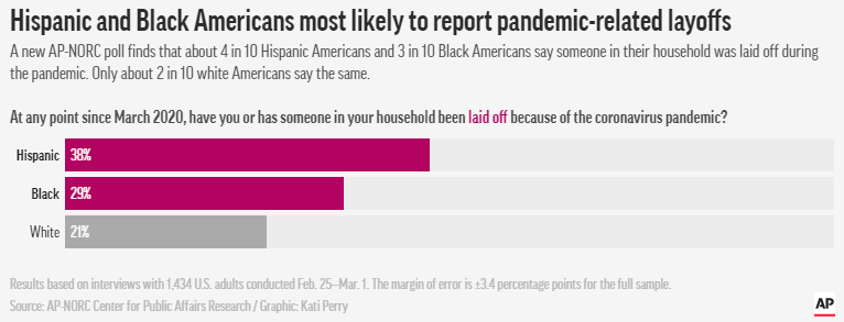 △AP-NORC民調:38%%的拉美裔美國人和29%的非洲裔美國人有親屬在疫情期間被解雇,而美國白人中的這一比例只有21%。