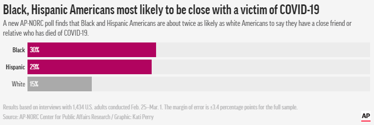 美聯社與芝加哥大學全國民意研究中心(AP-NORC)針對美國各階層成年人進行的一項最新民調顯示,與美國白人相比,非洲裔和拉美裔美國人更容易因疫情失業或遭受其他經濟損失,有親友死于新冠病毒的概率也更高,而他們接種新冠疫苗的可能性卻更小。