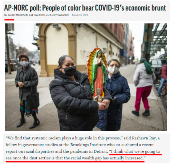 美聯社報道還援引布魯金斯學會研究員拉肖恩·雷的觀點指出,疫情會進一步加大美國業已存在的種族貧富差距。