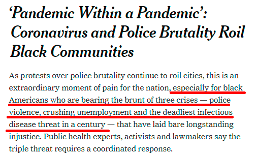 《紐約時報》此前曾以《“大流行中的大流行”》為題發表評論文章,稱非洲裔美國人正遭受著“警察暴力”“極高的失業率”和“最致命的傳染病”三重威脅,這暴露了美國長期存在的社會不公。
