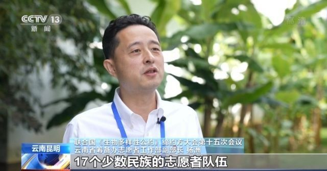 聯合國《生物多樣性公約》締約方大會第十五次會議云南省籌備辦志愿者工作部副部長 楊洲:志愿者隊伍分別來自彝族、傣族、哈尼族、傈僳族、獨龍族、白族等在內的17個少數民族,也展示了民族文化多樣性的風采。