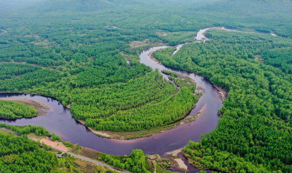 這是內(nèi)蒙古呼倫貝爾根河源國家濕地公園景色(無人機(jī)照片,2021年6月8日攝)。新華社記者 連振 攝