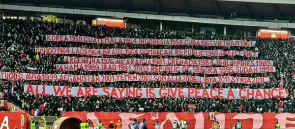 當地時間17日,歐聯杯八分之一決賽次回合比賽中,主場的塞爾維亞球迷在看臺上打出六條巨大橫幅,按年份細數美國、北約組織參與入侵過的20多個國家。最大的一條橫幅則寫著“我們想說的是,給和平一個機會!”這是約翰·列儂著名歌曲《給和平一個機會》里的歌詞。全場球迷高唱這首歌,諷刺西方口喊“反戰”,行動上卻一直在拱火。