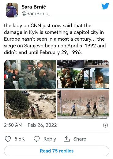 △塞爾維亞網友痛斥美媒無知:美國有線電視新聞網(cnn)說基輔受到的破壞是歐洲首都城市近百年所未見,但薩拉熱窩在90年代可是被圍困了四年之久。