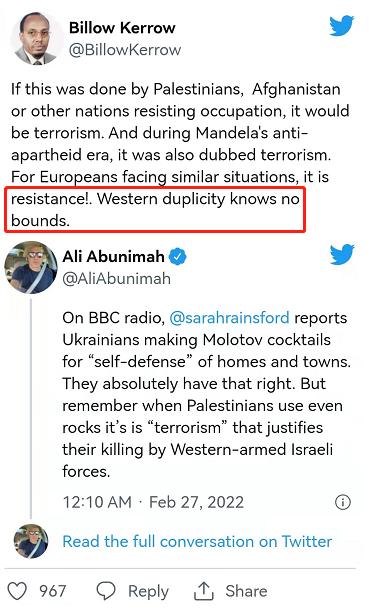 一位記者指出,英國廣播公司(bbc)對烏克蘭人制作燃燒瓶對付俄羅斯軍人的行為大加贊揚,但當巴勒斯坦人因為向裝備全副西式武裝的士兵扔石子被殺時,西方卻稱巴勒斯坦人為“恐怖分子”。一位肯尼亞政治家說得更直接:“西方雙標起來沒有底線。”