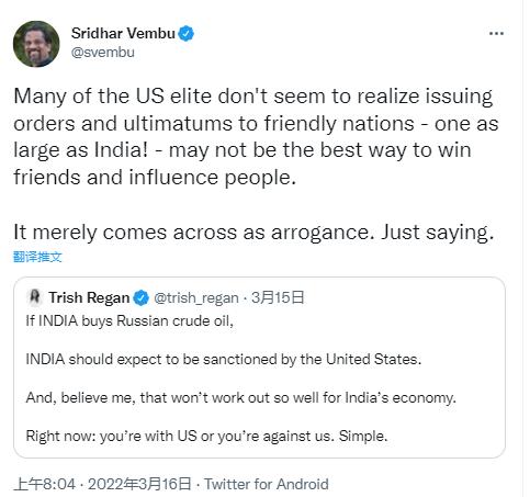 美國福克斯商業頻道女主播翠西·里根15日也在社交媒體上發文稱,“如果印度購買俄羅斯原油,應該受到美國制裁。這對印度經濟來說不是好事。現在(印度面臨的選擇)是支持美國還是反對美國,這很簡單。”印度富商、軟件公司zoho創始人斯里達爾·芬布隨后轉發該帖文寫道,“許多美國精英似乎沒有意識到,對一個像印度這樣大的友好國家發號施令和下達最后通牒,可能不是贏得朋友和影響他人的最佳方式。只能給人傲慢的印象。”