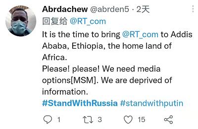 一位受不了西方媒體虛偽和雙標說辭的埃塞網友呼吁俄羅斯媒體增強在非洲的存在,因為西方媒體“剝奪”了他們的信息獲取。