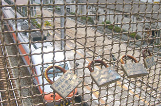 大大小小的鎖掛滿天橋鐵絲護欄,多半是銅黃色的鎖,也有號碼鎖,還有人用摩托車、汽車的大鎖,呂姓高中生說:“鎖大一點,念力才更大呀!”