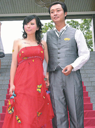準新娘陳韻如(左)紅禮服上停滿蝴蝶,準新郎顏志達挽著她趕緊拍照,因為10分鐘后禮服上的蝴蝶就要飛走了。來源:臺灣《聯(lián)合報》