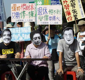 現(xiàn)場抗議民眾戴上畫有馬英九頭像的面具,諷刺當(dāng)局勞工政策。(圖片來自臺(tái)媒)