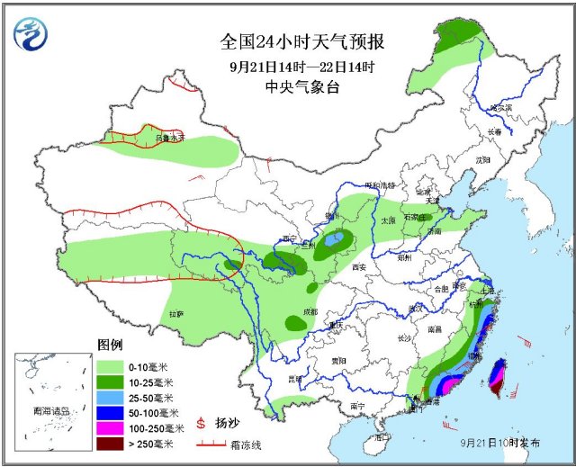 21日14時至22日14時全國天氣預報,臺灣南部臺東、屏東等地可能將降250毫米以上特大暴雨。(圖片來源:中央氣象臺)