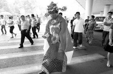 據《東方今報》報道,昨日,鄭州市紫荊山公園西門有人身穿大紅袍,頭戴金冠,手中抱著“聚寶盆”(如圖)。路人紛紛觀看,有人還不時往“聚寶盆”里放錢。
