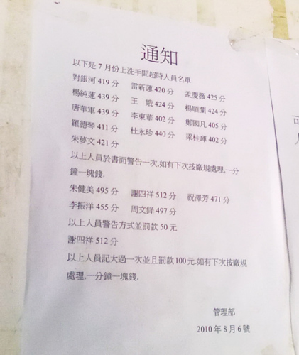 黃江友邦塑膠五金電器制品廠地處黃江板湖,是一家成立于1974年的港資企業(yè),主要生產(chǎn)金屬禮品及家庭用品,約有員工三百余名。日前,該公司門衛(wèi)處貼出了一張?zhí)厥獾奶幜P通知。通知稱,謝四祥等18名員工因在7月份上洗手間超時受到不同程度的處罰,其中謝四祥的處罰最重,被記大過一次且罰款一百元。