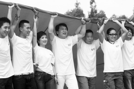 資料圖片:成龍率隊與北川中學(xué)千名師生共展巨幅國旗。