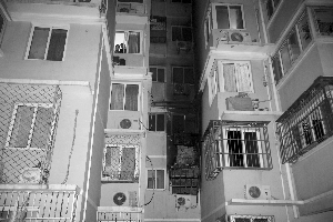 昨日,東直門內(nèi)大街4號(hào)樓,起火房屋附近的外墻被熏黑。本報(bào)記者 王嘉寧 攝