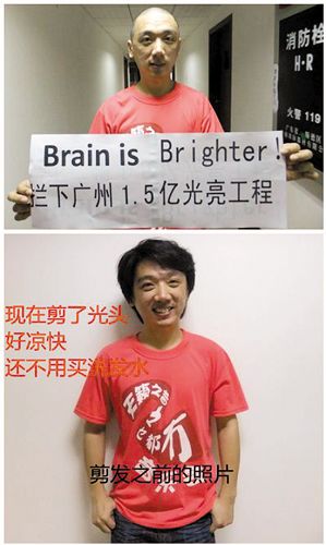 “征集光頭,照亮廣州”,27日凌晨1時許,一位網名“brainisbrighter”的廣州仔發表了一篇題為《征集廣州市民剪光頭照亮廣州,攔下1.5億光亮工程》的博文,同時貼出自己削發過程等照片,并在新浪微博轉發,引來眾多網民熱議。