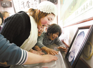親人趴在冰棺上痛哭,左三為穿孝的小敏。