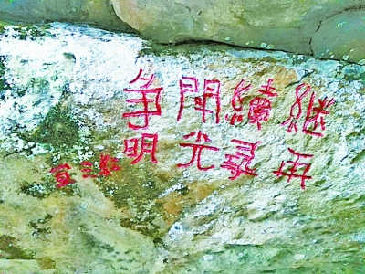 這是一塊直插云天的巨石,從陡峭的山腰上橫伸出來。巨石上刻有兩條標(biāo)語,其中一條寫道:“繼續(xù)斗爭,再尋光明。”這是紅軍的筆跡。