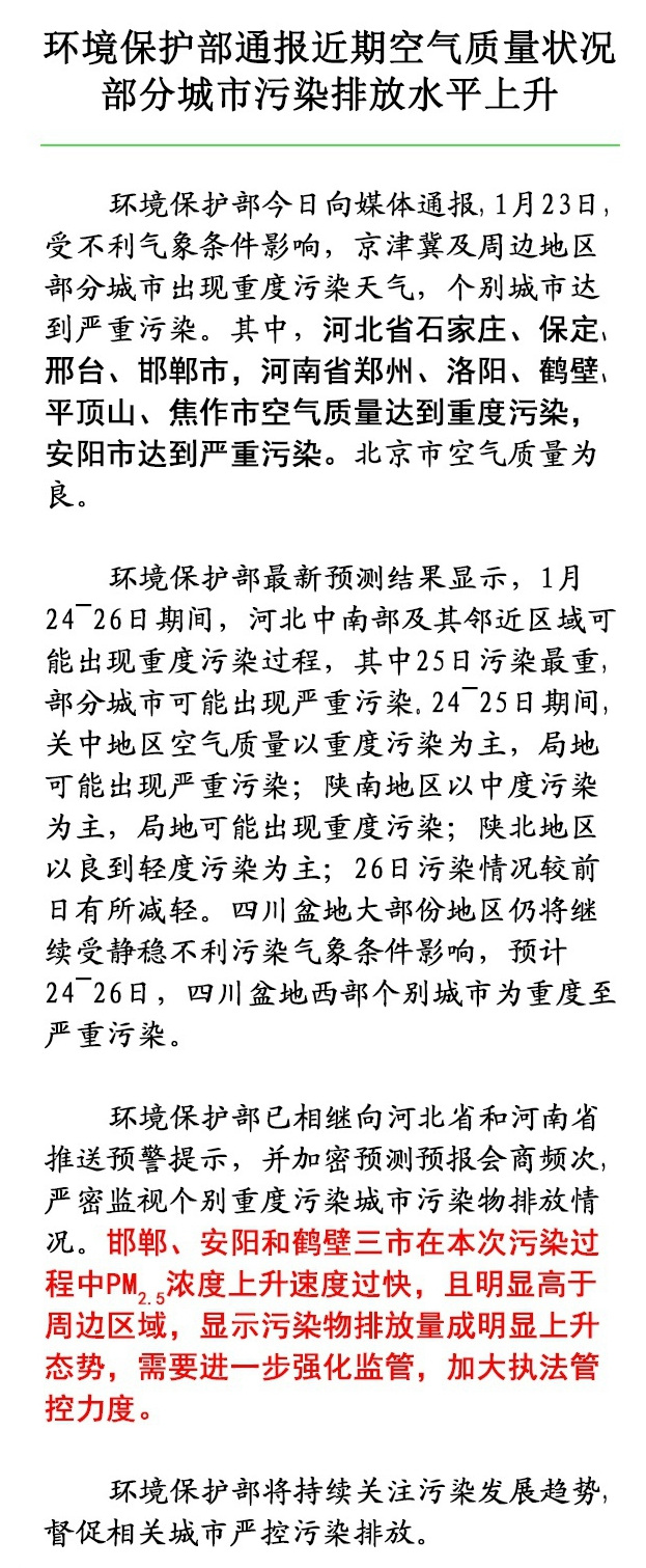 中新網1月24日電 據環境保護部宣傳教育司官方微博消息,環保護今日通報近期空氣質量狀況,稱京津冀及周邊地區部分城市出現重度污染天氣。其中,邯鄲、安陽和鶴壁三市在本次污染過程中PM2.5濃度上升速度過快,且明顯高于周邊區域,顯示污染物排放量成明顯上升態勢,需要進一步強化監管,加大執法管控力度。